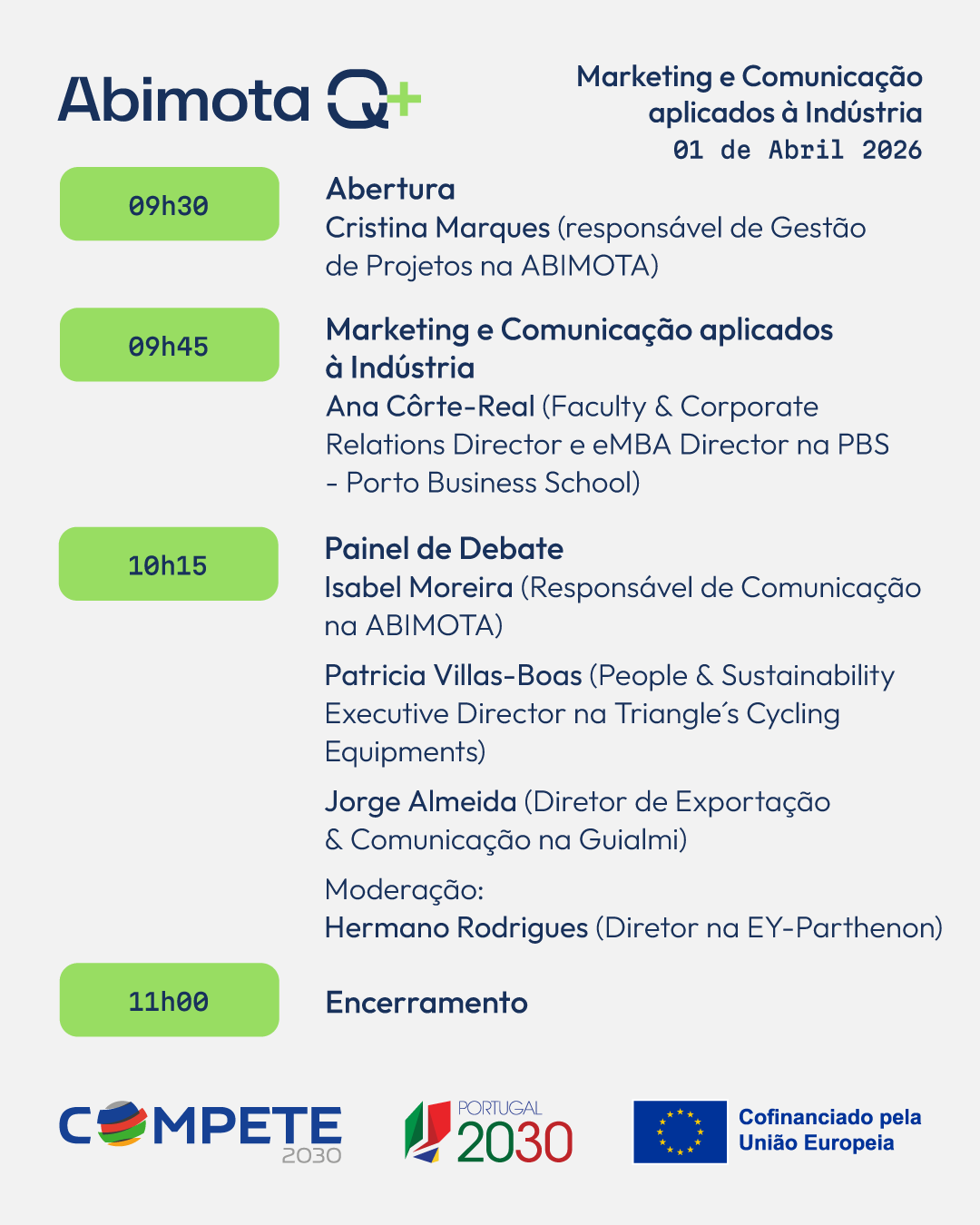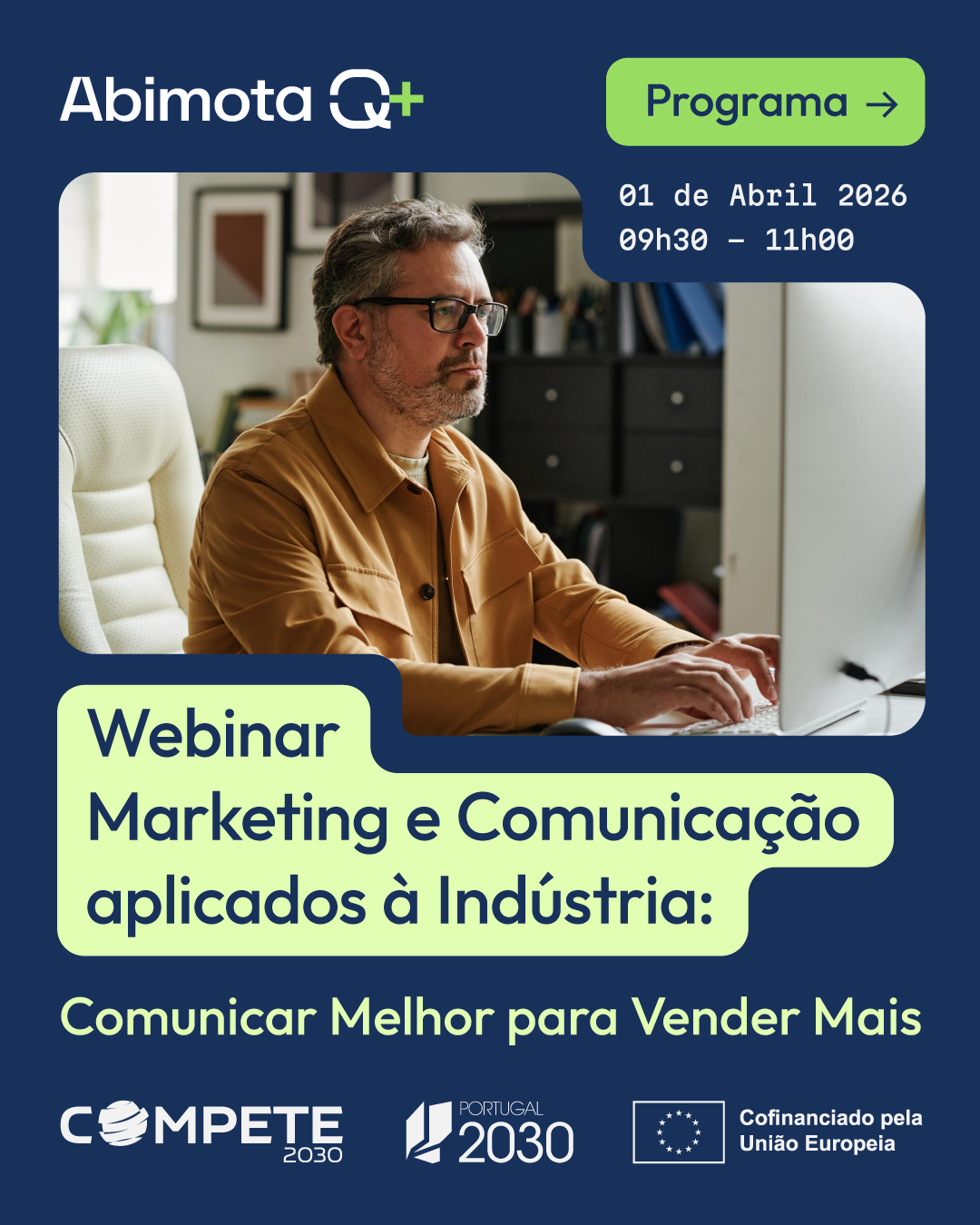 O webinar dedicado ao Marketing dá continuidade ao ciclo de encontros temáticos promovidos pelo projeto ABIMOTA Q+, reforçando o compromisso de apoiar o desenvolvimento das PME da indústria transformadora. Num mercado cada vez mais exigente, o Marketing assume um papel estratégico para fortalecer o posicionamento competitivo das empresas – da definição da proposta de valor à capacidade de comunicar relevância e diferenciação.